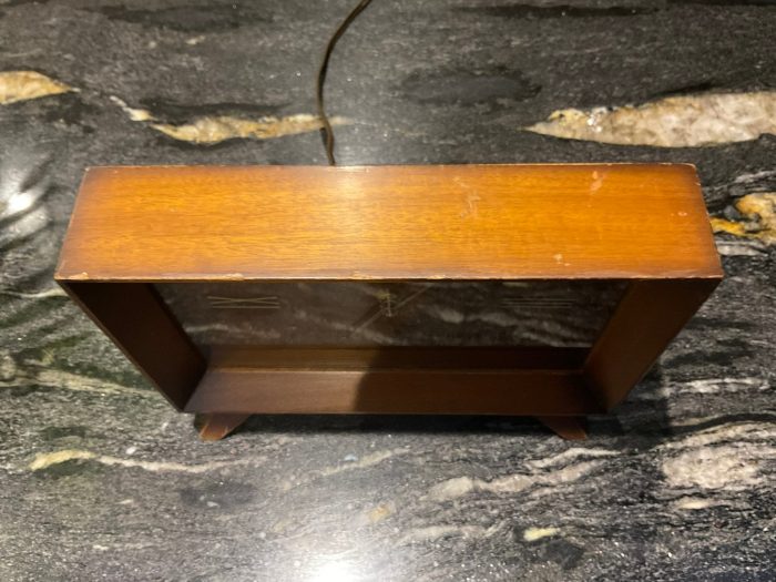 This clock dates from the 1950s to early 1960s and has the original Lynside model label on the back. The wooden case has scratches, dents and marks but this does not distract from the vintage charm of this clock.